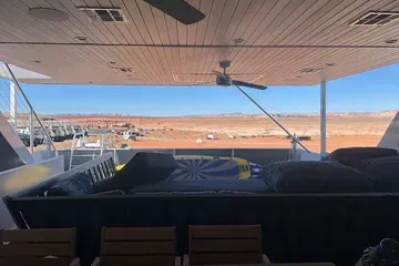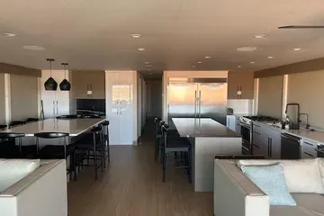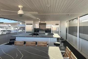 Ovation is a custom-designed 87×22-foot reverse floor plan houseboat built for comfort, entertainment, and large groups, offering deluxe interior accommodations for 20 guests and sleeping space for up to 30 adults. It features luxury amenities such as a third-level sun deck with a fire pit and Sunbrella seating, multiple entertainment systems with 60-inch TVs and surround sound, Starlink internet, dual bars with granite counters, and a fully stocked gourmet galley.