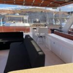 Outside, guests can enjoy an open fly bridge with helm controls, a wet bar and shaded canopy on the upper deck, a rear deck slide, BBQ grill, swim platform with watercraft ramps, and powerful twin MerCruiser V8 engines that make every trip on the water both relaxing and exciting.