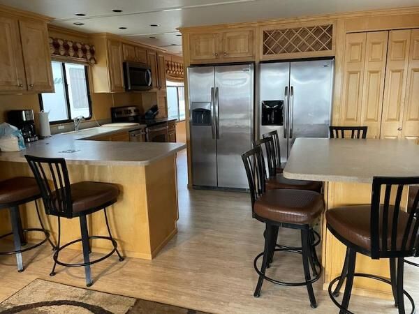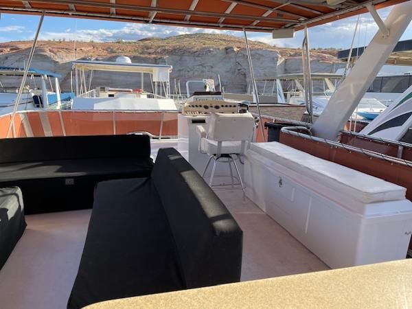 Outside, guests can enjoy an open fly bridge with helm controls, a wet bar and shaded canopy on the upper deck, a rear deck slide, BBQ grill, swim platform with watercraft ramps, and powerful twin MerCruiser V8 engines that make every trip on the water both relaxing and exciting.