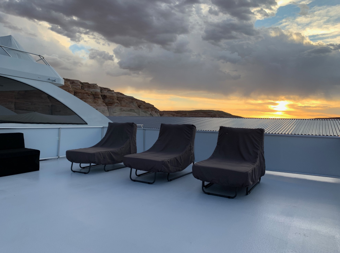- (2) couches with 8 sleeping pads on sun deck