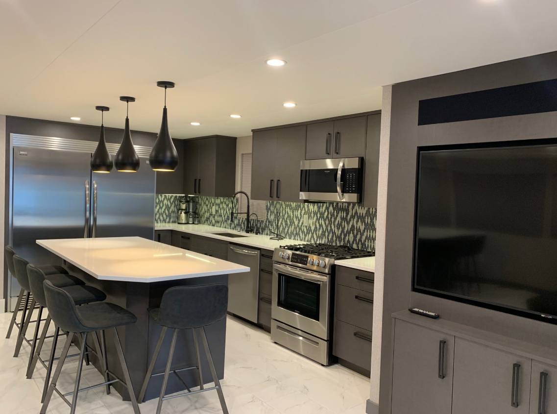 - Custom entertainment center with 60” TV & surround sound